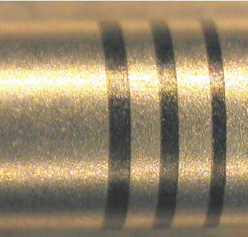 醫療器械行業所要求的標記風格被稱為“深色標記或退火標記。”該標記不會從部件上去除任何材料,因而避免了任何污染物聚積的潛在可能性。當處理部件時,深色或退火標記一定不能被材料表面所感知到。圖1顯示的是醫療設備上常使用的深色型標記。