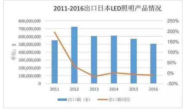 雖然日本作為照明產(chǎn)品制造大國和強國,具備自給自足能力,但仍是我國照明產(chǎn)品出口的重要市場。2015 年我國出口日本的全部照明產(chǎn)品 13.4 億美元,同比減少 14.2%;其中 LED 照明產(chǎn)品 5.7 億,同比減少 6.57%,出口額位居出口目的國第 4 名,而 2016 年 LED 照明產(chǎn)品約為 5 億,同比進一步下滑,依然高居出口目的國第 4(除轉(zhuǎn)口的香港)。