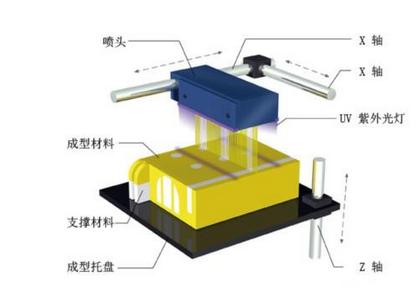 工藝原理:沿著X軸前后滑動,在成型室里鋪上一層超薄的光敏樹脂。每鋪完一層后,噴頭架邊上的紫外光球立即發射紫外光,快速固化和硬化每層光敏樹脂。該步驟減少了使用其他技術所需的后處理過程。每打印完一層,機器內部的成型底盤就會極為精確地下沉,而噴頭繼續一層一層地工作,直到原型件完成。成型時使用了兩種不同的光敏樹脂材料:一種是用來成型實體部件的成型材料,另一種類膠體的用來支撐部件的支撐材料。