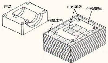 在這種快速成形機上,截面輪廓被切割和疊合后所成的制品,如上圖所示。其中,所需的工件被廢料小方格包圍,剔除這些小方格之后,便可得到三維工件。