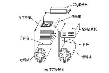 工藝原理:其采用薄片材料,如紙、塑料薄膜等。事先在片材表面涂覆上一層熱熔膠,加工時,采用熱壓輥熱壓片材,使之與下面已成形的工件粘接;用CO2激光器在剛粘接的新層上切割出零件截面輪廓和工件外框,并在截面輪廓與外框之間多余的區域內切割出上下對齊的網格;激光切割完成后,工作臺帶動已成形的工件下降,與帶狀片材(料帶)分離;供料機構轉動收料軸和供料軸,帶動料帶移動,使新層移到加工區域;工作臺上升到加工平面;熱壓輥熱壓,工件的層數增加一層,高度增加一個料厚;再在新層上切割截面輪廓。如此反復直至零件的所有截面粘接、切割完,得到分層制造的實體零件。