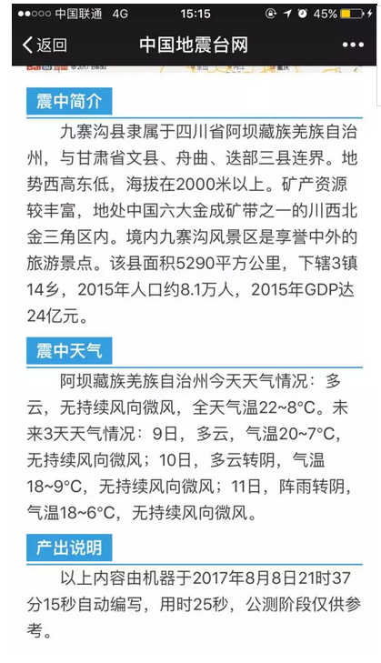 2017年8月8日,四川阿壩藏族羌族自治州九寨溝縣發生7.0級地震。然而,小編在心系四川同胞安危的同時發現,在地震發生后的十幾分鐘后(即8月8日21時37分15秒),中國地震臺網機器人自動完成稿件編寫,全程僅用25秒便出稿540字,并配發4張圖片,內容包含速報參數、震中地形、熱力人口、周邊村鎮、周邊縣區、歷史地震、震中簡介、震中天氣8大項。
