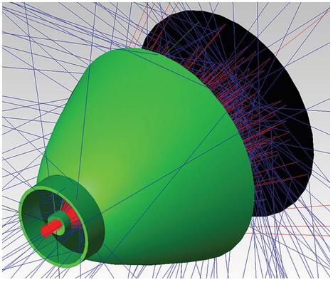 圖4.用于小型激光泵浦燈的一種高效泵浦裝置。泵浦光(紅色光束)從左側進入,通過凹光束擴張透鏡,擴展到右側的熒光體涂層玻璃板面上,并入射到有機硅結合的熒光體層上。下轉換光顯示為藍光。在圖中,熒光板顯示為不透明,與綠色反射鏡分離,目的是可以看到反射器外殼內的光線的軌跡。在實際的燈中,熒光板(允許光線向外逸出的透明玻璃片)被密封到反射器邊上。只有很少的光線反向反射回左側的激光模塊(未示出)。