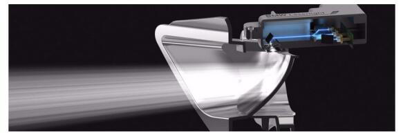 圖2.寶馬的激光前照燈具有單獨的激光二極管、光束組合器、熒光體靶和反射器組件。