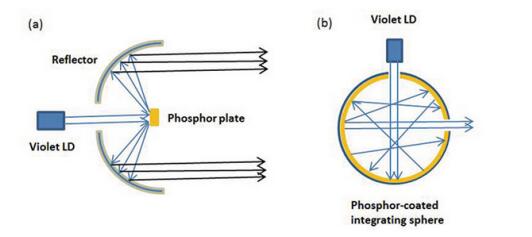 激光泵浦的一個相對簡單的方法是將激光器引導到熒光體板并且用反射器準直所得到的輻射(參見圖3(a))。 然而,在光功率轉換方面,使用熒光體涂覆的積分球更有效(參見圖3(b))。