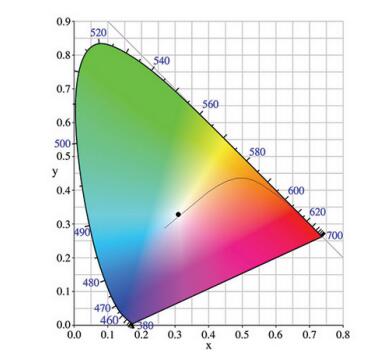 圖1.來自激光二極管泵浦白光燈的光的色度點幾乎是中性的(x=0.3305,y=0.3309),證明了光源的光譜豐富度。圖中的黑線是普朗克軌跡。