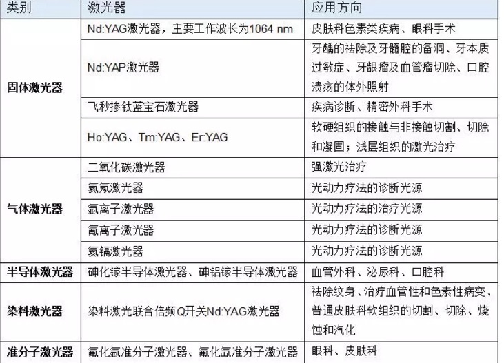 不同種類的激光器其參數性能和工作方式不一樣,其與人體生物組織的相互作用也不同。確定所需醫用激光的參數性能和所需要的工作方式后,基本就可以確定適合的具體激光種類了,下面我們依據常用工作物質分類對一些典型的醫用激光器件及主要臨床應用作簡要介紹。