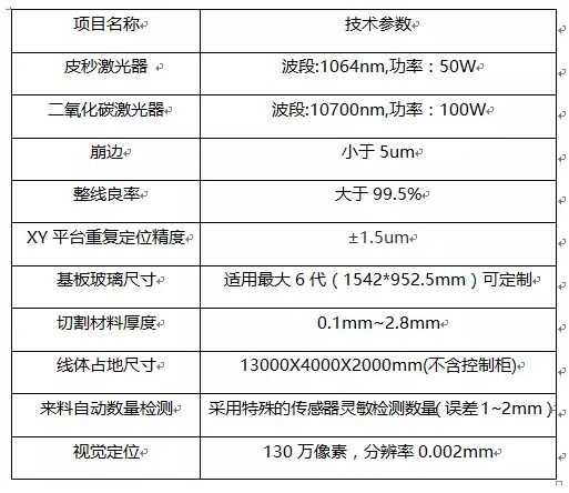 整條線體配備一臺開料及切割機、兩臺激光裂片機、一臺分揀機并采用6軸機械手上下料及分揀,由A,B,C,D,E,F共7個工站組成,實現從基板整框來料到成品分揀到成品框,全程全自動不需要人工作業,基板玻璃適合最大6代線,玻璃厚度0.1~2.8mm ,玻璃的利用率可高達97%以上。