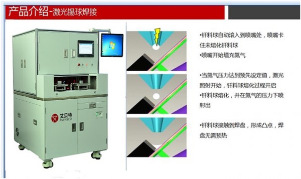 激光通過(guò)光纖傳輸,輸出口安裝于錫球出口上方,在環(huán)形腔體上放置有供高壓氣進(jìn)入的入口,通過(guò)激光融化錫球,然后高壓惰性氣體可保證有足夠的壓力將熔化的錫球滴落,又可以保證熔化的焊錫不會(huì)被氧化,焊接精度高,焊接效果好,尤其適用于極高精度的焊錫需求。