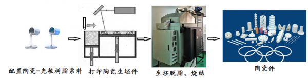 近年來,陶瓷3D打印逐漸興起,據國際權威機構預測,3D打印陶瓷市場的全球規模有望從2016年的2780萬美元,增長至2021年的1.315億美元,期間的復合年增長率(CAGR)將高達29.6%,2027年將達到10億美元,在航空航天,醫療,工業制造甚至消費品領域將會迅速普及。陶瓷3D打印方法有多種,其中較先進方法采用的原料是陶瓷-光敏樹脂漿料,工藝流程如下:
