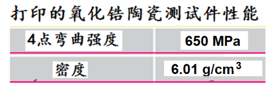 采用高陶瓷容積比的漿料,所含成分長時間不偏析、不沉降,打印陶瓷件有高密度和高強度(氧化鋯陶瓷測試件的3點彎曲強度可達750 -1000 MPa)。