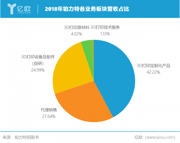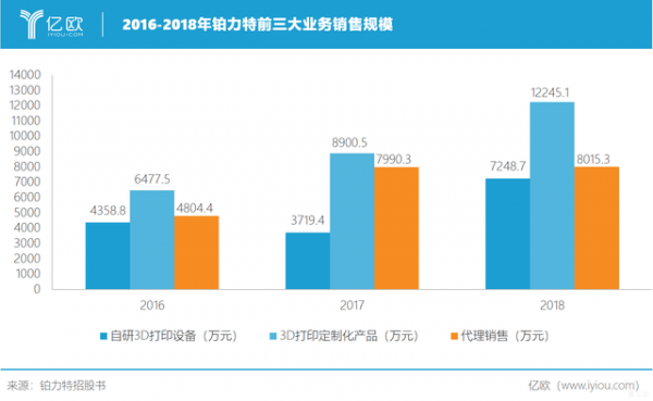 代理銷售競爭對手EOS產(chǎn)品的業(yè)務(wù),最能反映鉑力特建立品牌認(rèn)知和市場開拓的艱難。2018年,鉑力特代理銷售設(shè)備及配件模塊業(yè)務(wù)營收8015萬元,占全年總營收的27.64%,僅次于3D打印定制化產(chǎn)品業(yè)務(wù)。過往三年,鉑力特代理設(shè)備銷售業(yè)務(wù)也一直是公司第二大營收來源。