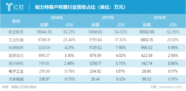鉑力特的產(chǎn)品也多應(yīng)用于國家航空航天領(lǐng)域的重點項目中。以2018年為例,鉑力特在航空航天領(lǐng)域的營收占到總營收的62.21%,其前五大客戶均來自于航空航天領(lǐng)域。