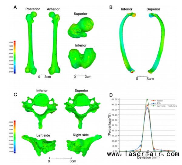 分析原始樣本和3D打印模型之間的偏差。偏差光譜上的等級均為0.5mm;綠色表示偏差在-0.5到0.5mm之間;較熱的顏色表示正偏差范圍為0.5到2mm;冷色表示負偏差范圍為-0.5至2mm。(A)股骨,(B)肋骨,(C)頸椎骨的偏差分析;(D)偏差分布(%)。