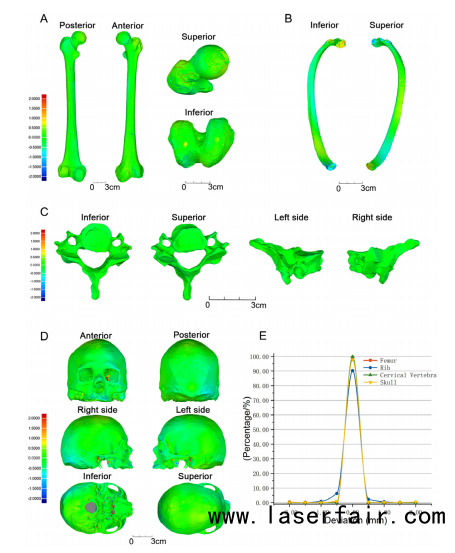 分析數(shù)字模型和3D打印模型之間的偏差。偏差光譜上的等級均為0.5mm;綠色表示偏差在-0.5到0.5mm之間;較熱的顏色表示正偏差范圍為0.5到2mm;冷色表示負偏差范圍為-0.5至2mm。(A)股骨,(B)肋骨,(C)頸椎骨的偏差分析;(D)頭骨;(E)偏差分布(%)。