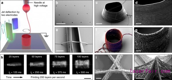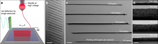 本文詳細介紹了這一新技術,闡述了為克服現有增材制造技術對生產速度的限制,提出了靜電射流偏轉法。從他們的測試中,研究人員發現靜電射流偏轉可以通過層層疊加納米纖維來打印具有亞微米特征的三維物體,頻率高達2000赫茲。