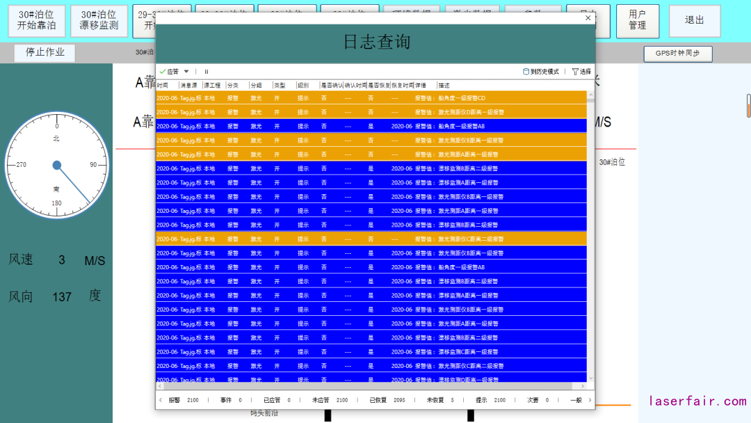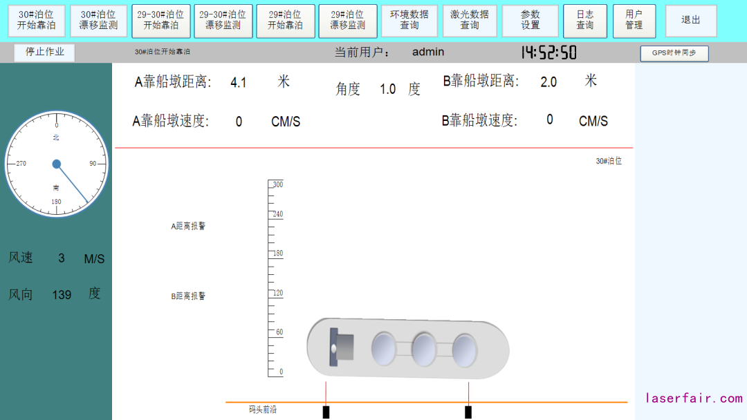 連云港新東方國際貨柜碼頭安裝的激光靠泊系統主要由激光測距儀、風速儀、數據采集終端、在線監控程序組成,由連云港中遠海運有限公司開發。系統前端利用安裝在碼頭前沿的兩個平行的激光測距儀,探測船舶上的兩點離岸距離,根據一定時間間隔的不同距離,折算出速度;根據兩點的距離計算出船舶與碼頭的角度,同時監測風速風向,利用計算機算法算出船舶的靠泊速度,將船舶靠泊碼頭的全過程實時呈現在軟件平臺,引航、海事、碼頭三方均可通過終端指導船舶靠泊作業,防止船舶靠泊時因速度過快或角度過大而發生碼頭設施損壞及設備事故。