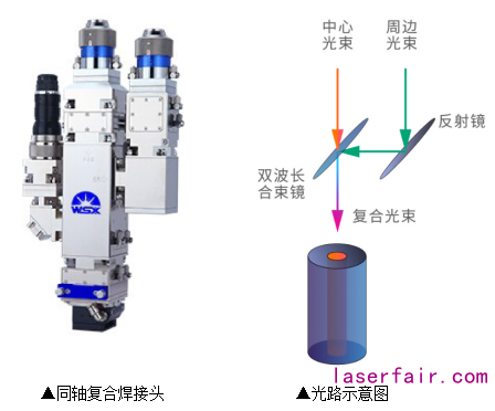 激光復合焊接一般指將兩不同狀態(空間位置、光束質量、光斑形態、光束能量、光波長、作用時間等)的光束作用在焊接位置完成激光焊接;比較常用的是兩種波長不同的光束進行同軸合成之后同時作用于焊接位置。