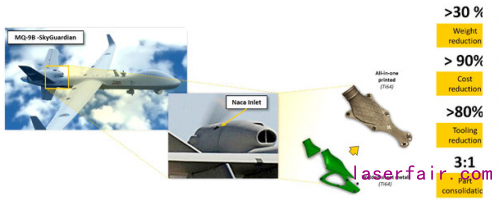 金屬增材制造,更通俗的名字是“3D打印”。在這架MQ-9B上3D打印的部件是進氣道的脊部板材,使用的是鈦合金Ti6Al4V(鈦六鋁四釩)材料,這是通用原子的增材制造團隊與GE增材制造工程咨詢團隊合作的產品。該零部件的傳統制造工藝是3個部分的鈦金屬薄板焊接成型,而采用3D打印整體制造后,免去了工裝、焊接、焊接質量檢驗等環節,并可將該零部件的成本降低90%以上,重量減少30%以上,模具減少約85%,顯著降低了重量以及生產環節的工時成本,也會簡化無人機制造上的供應鏈與庫存等方面的要求。