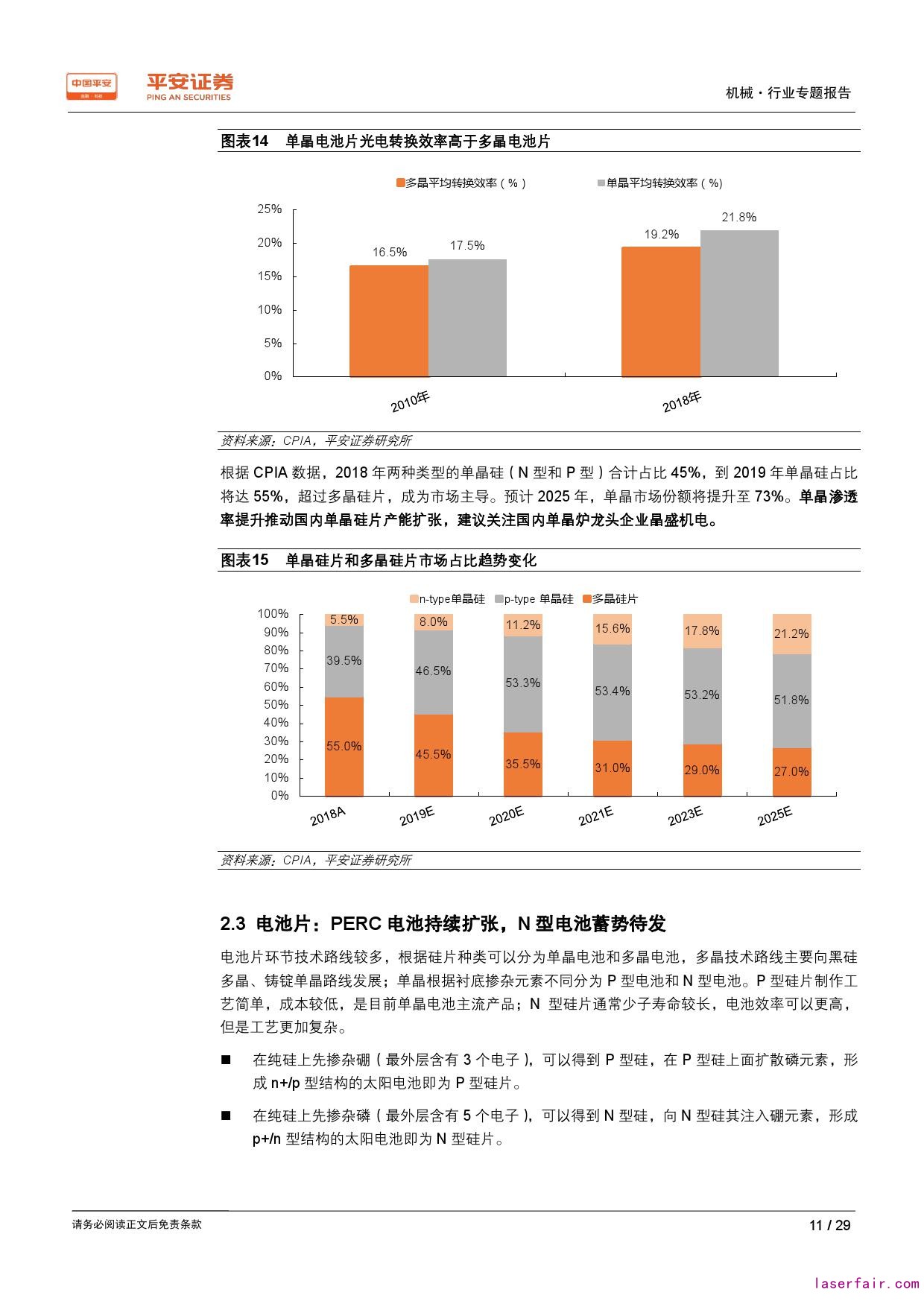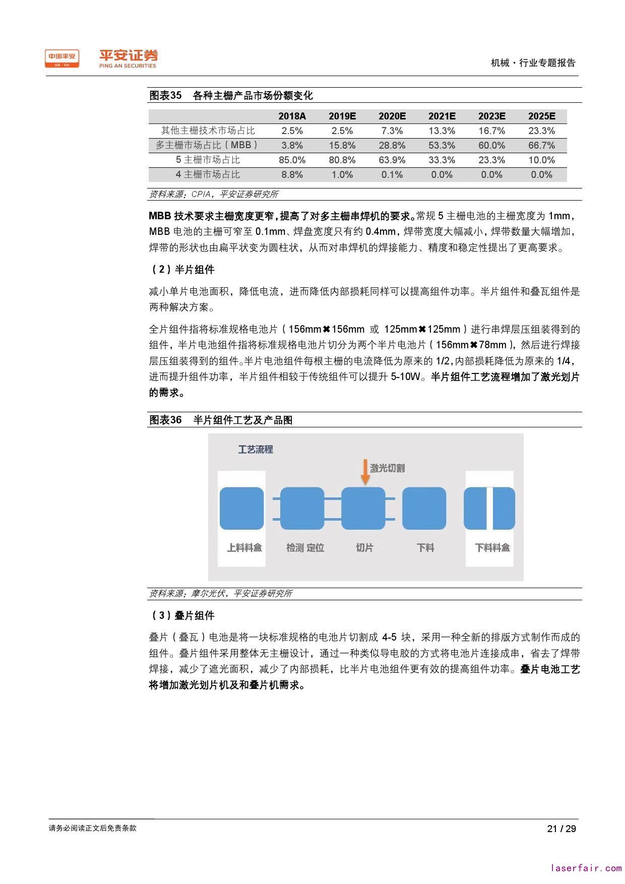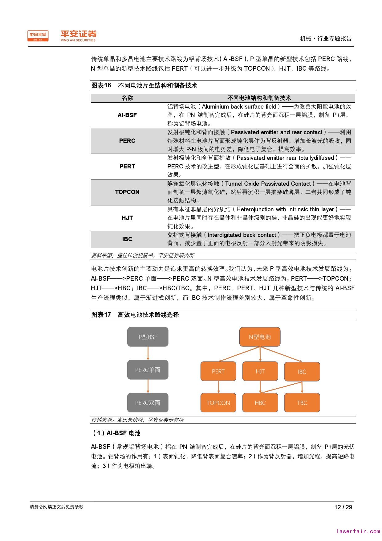 生產技術持續創新,推動設備加速迭代。光伏行業面臨平價上網的挑戰,發展新型的高效電池成為重要的突破口。行業呈現“一代技術,一代設備”的現象,生產技術的創新將推動設備迭代。光伏電池生產包括四大流程:硅料制程、硅片制程、電池片制程和組件制程。在硅片環節,單晶硅成為發展趨勢,帶動單晶硅片產能擴張。在電池片領域,PERC電池持續擴張,N型電池(PERT、HJT、IBC電池)蓄勢待發。在組件領域,多主柵、半片和疊片組件滲透率持續提升。建議關注單晶硅生長設備,PERC和N型電池片設備,以及新型組件技術帶來的激光劃片機、多主柵串焊機和疊片機等設備的投資機會。