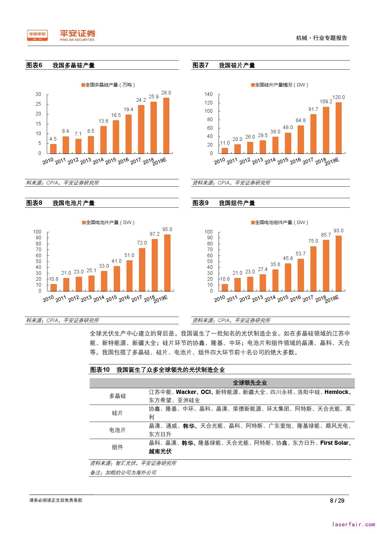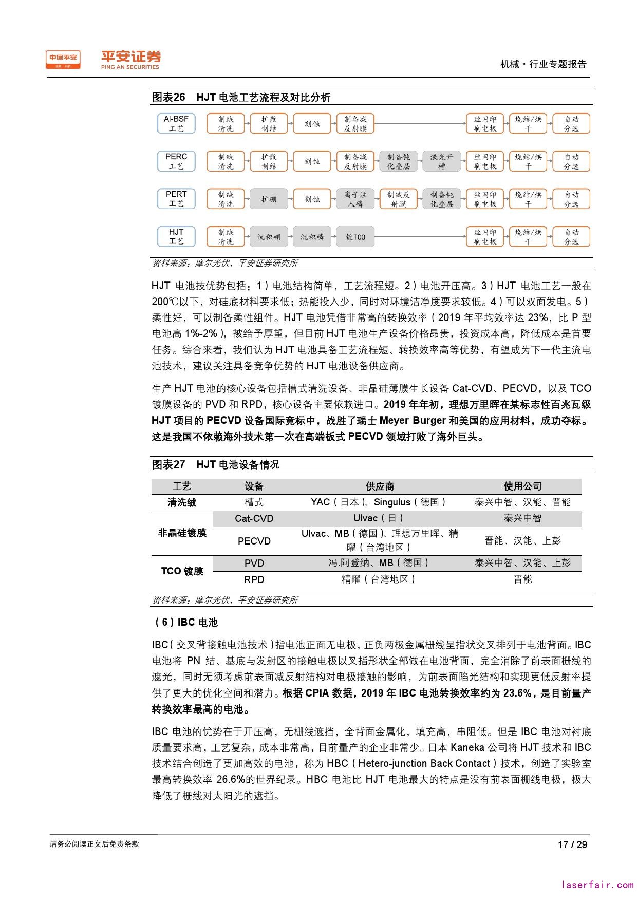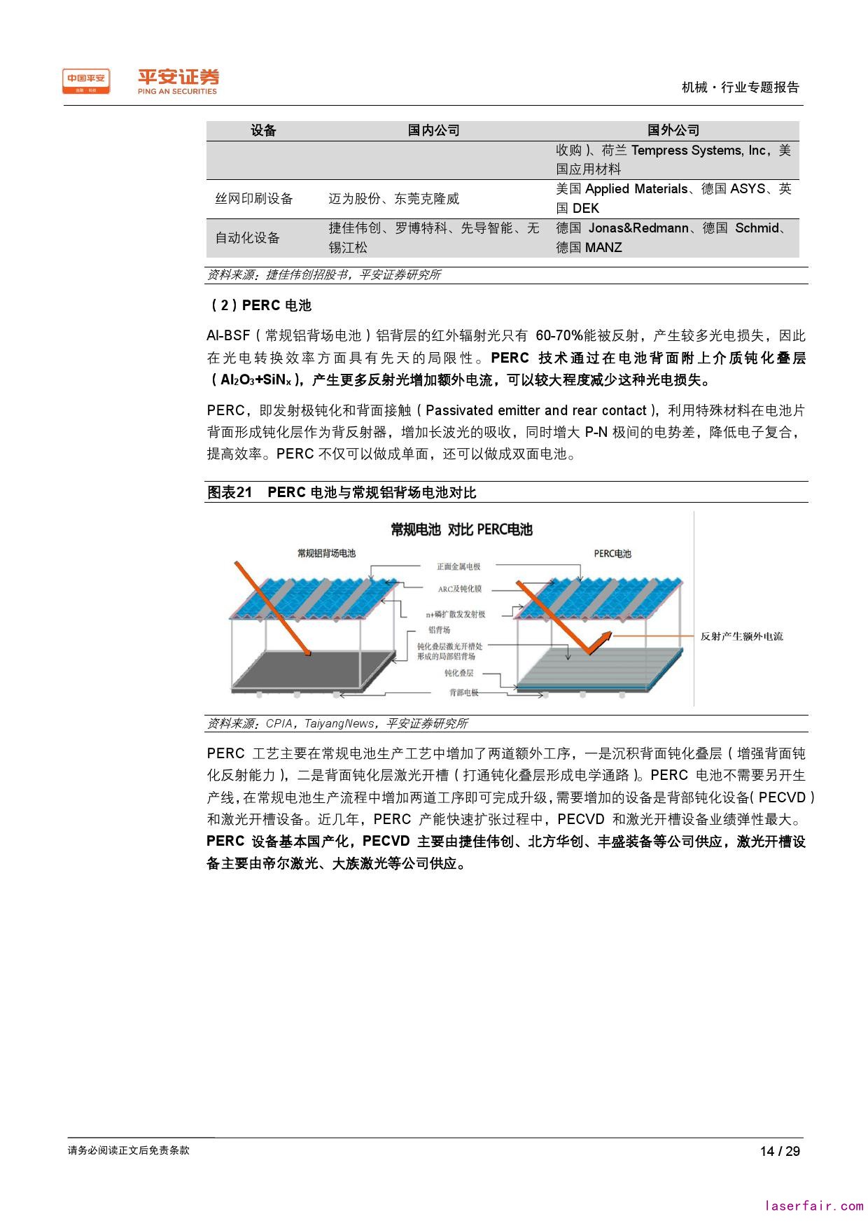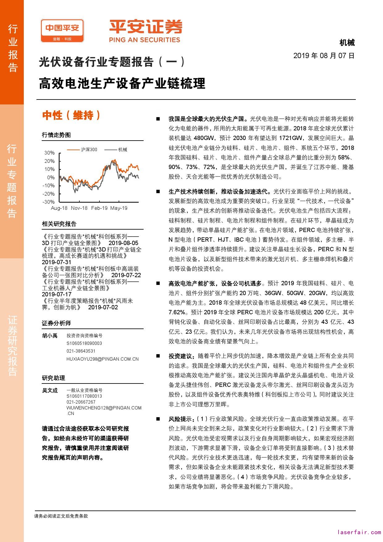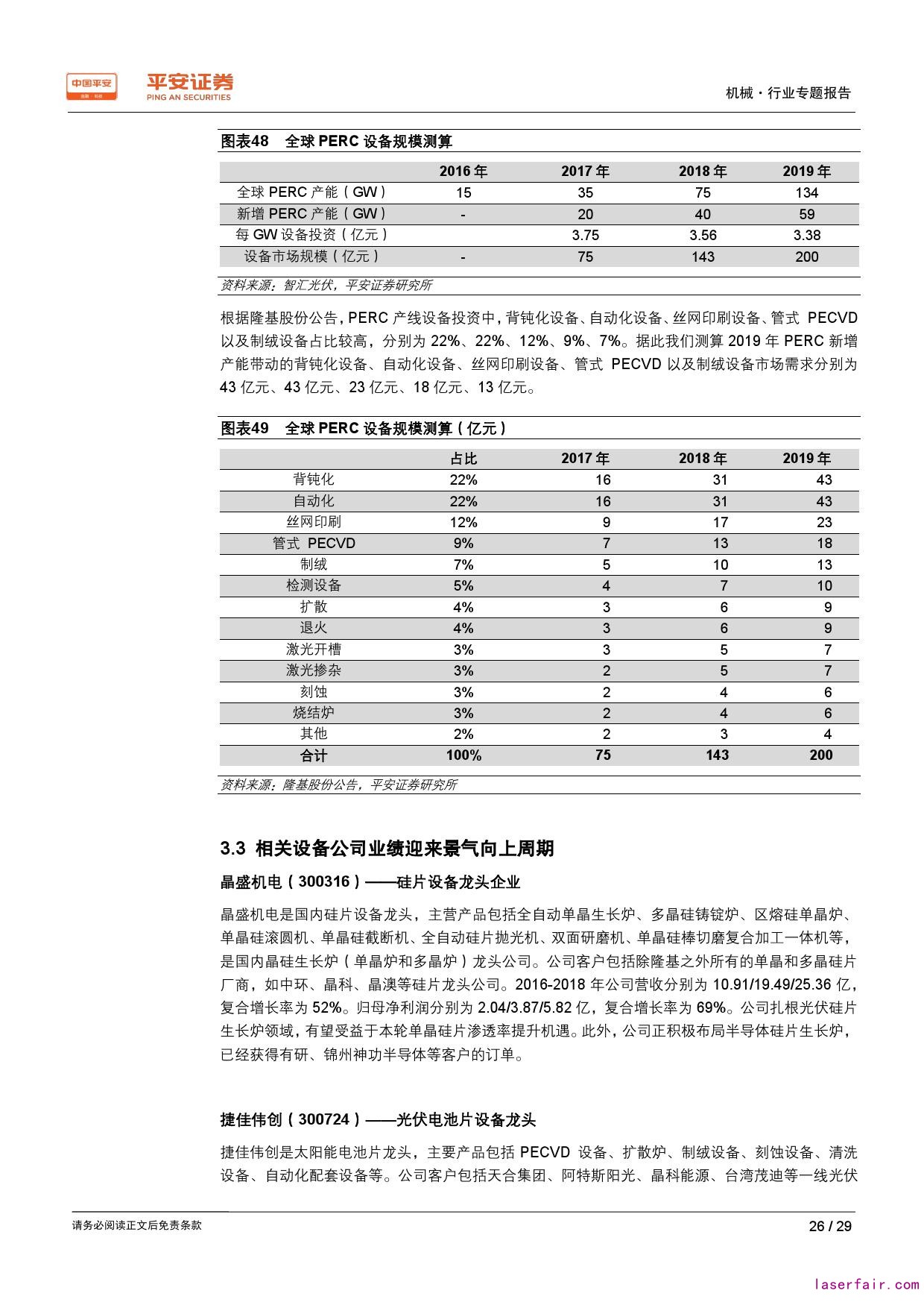 投資建議:隨著平價上網步伐的加速,降本增效是產業鏈上所有企業共同的追求。我國是全球最大的光伏生產國,硅料、電池片和組件生產企業積極推動高效電池產能擴張。建議關注國內單晶爐龍頭晶盛機電、電池片設備龍頭捷佳偉創、PERC激光設備龍頭帝爾激光、絲網印刷設備龍頭邁為股份,以及組件設備優秀代表奧特維(科創板擬上市公司),同時建議關注非上市公司理想萬里暉。
