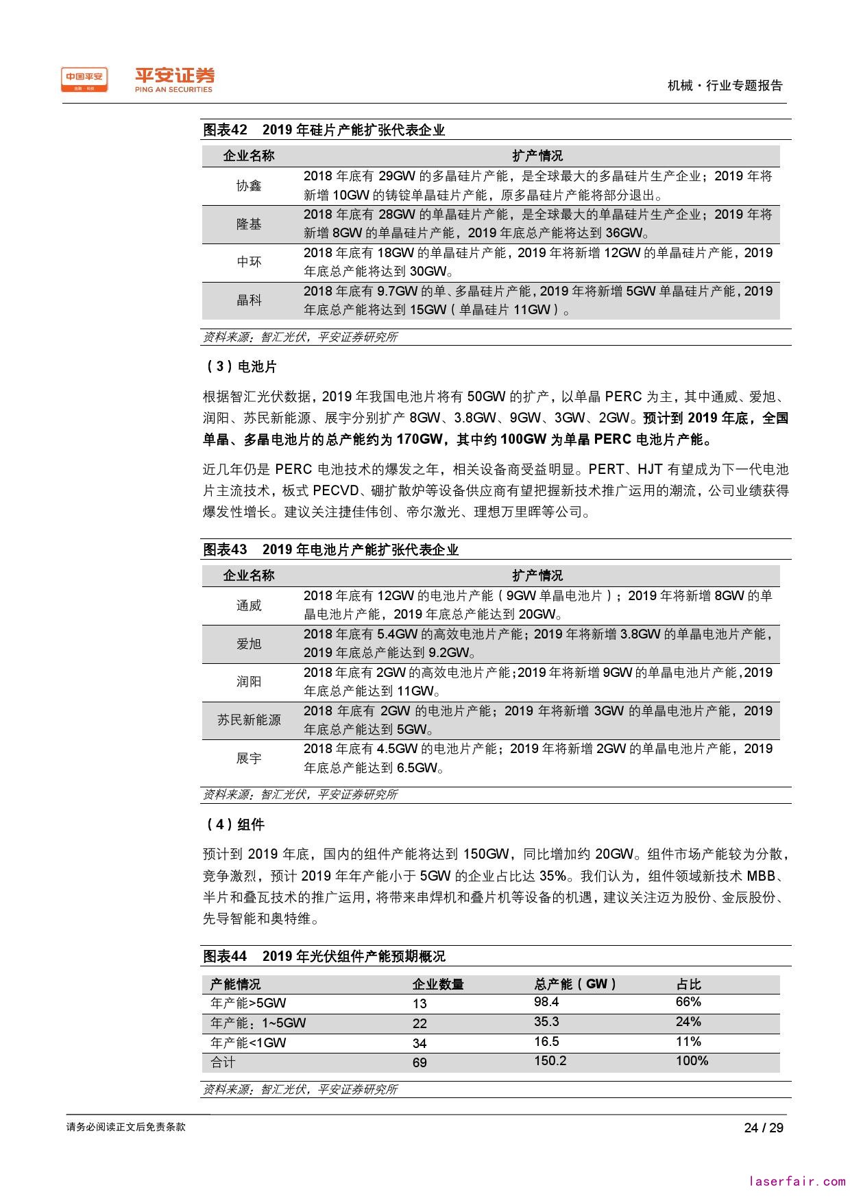 高效電池產能擴張,設備公司機遇多。預計2019年我國硅料、硅片、電池片、組件分別擴張產能約20萬噸、36GW、50GW、20GW,均以高效電池產能為主。2018年全球光伏設備市場總規模達48億美元,同比增長7.62%。預計2019年全球PERC電池片設備市場規模達200億元,其中背鈍化設備、自動化設備、絲網印刷設備占比最高,分別為43億元、43億元、23億元。我們認為,未來幾年光伏設備市場將出現結構性機會,高效電池的設備商業績有望景氣向上。