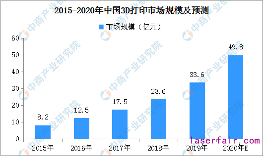 全球3D打印正火熱,由于中國引進3D打印技術較晚,與國外有一定差距,但近年來也得到快速發展。目前,中國的3D打印應用主要集中在家電及電子消費品、模具檢測、醫療及牙科正畸、航空航天等領域,未來將向醫療、建筑等更廣的應用場景發展。據數據顯示,2019年中國3D打印市場規模約為33.6億元。伴隨著中國3D打印技術的相應成熟,在航天航空,汽車等行業需求將持續增加,預計2020年中國3D打印市場規模將近50億元。
