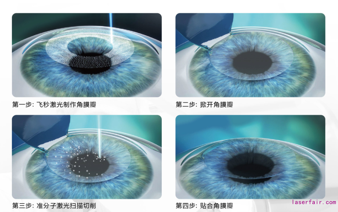 先用飛秒激光打開角膜,再用準(zhǔn)分子激光把角膜里面的東西“削”出一個(gè)“眼鏡”,再把角膜蓋回去就好了。