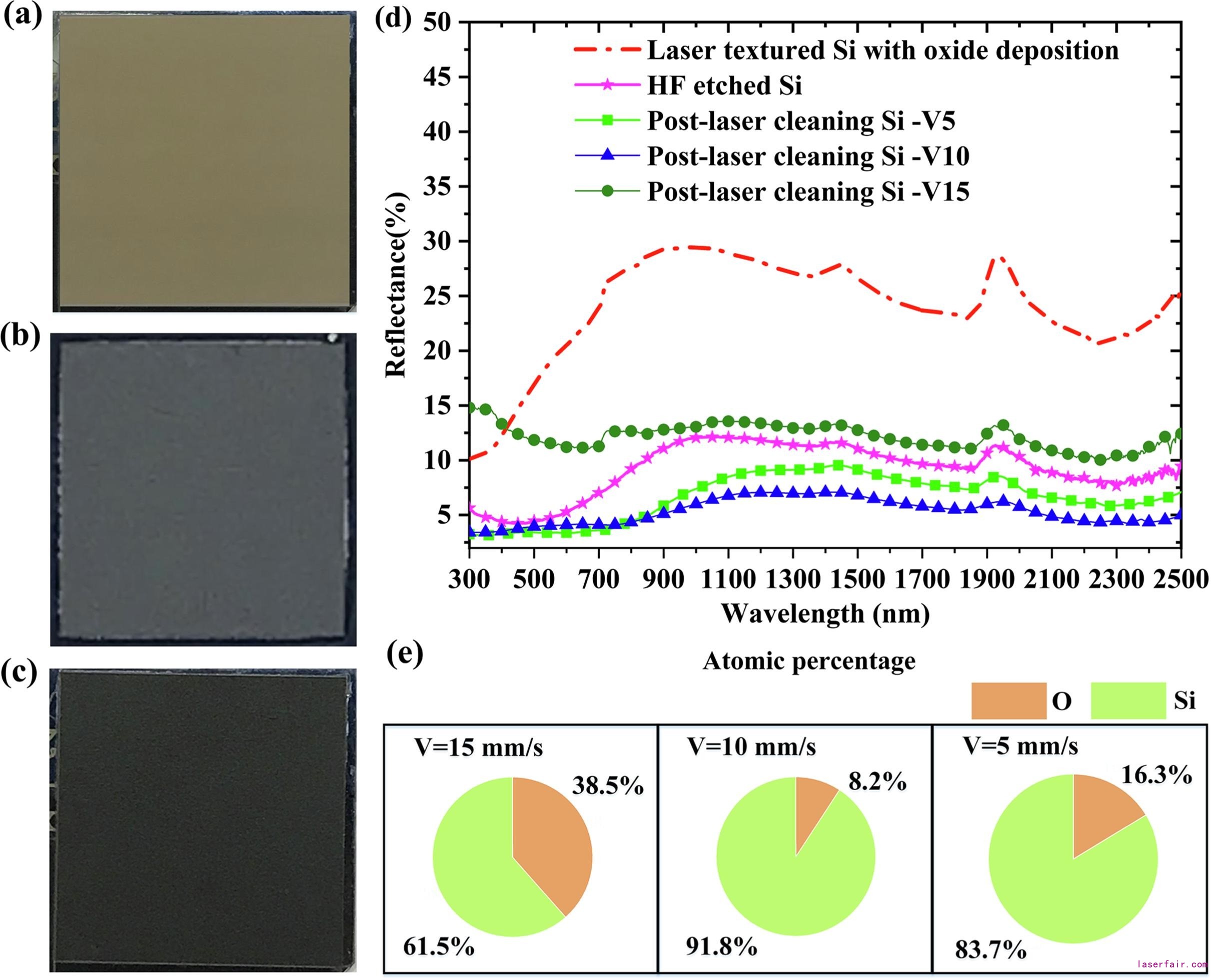圖解:(a) Si表面激光織構(gòu)后得到的氧化物沉積的形貌; (b)–(c) 激光掃描速度為15 和 10 mm/s時(shí),激光清洗后Si表面的形貌; (d) 制備的微納結(jié)構(gòu)的抗反射效果測量數(shù)據(jù); (e) Si表面的化學(xué)成分分析