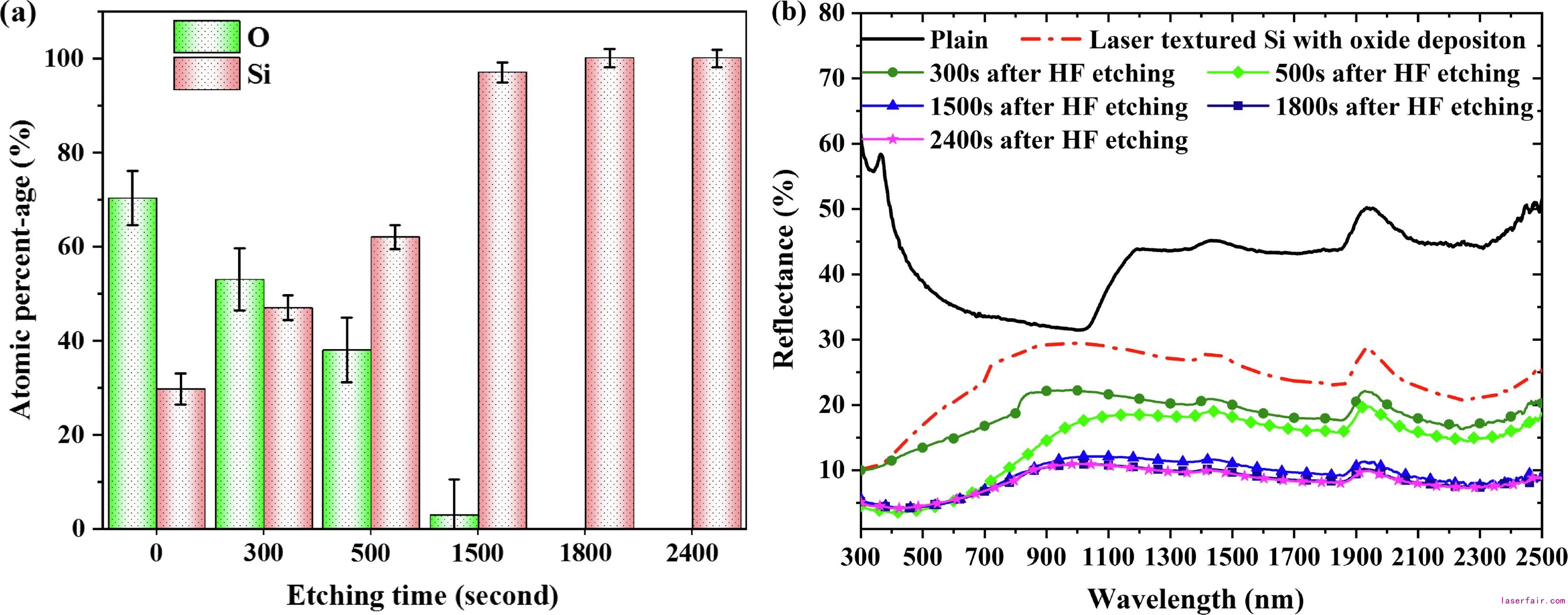 a)Si表面在不同蝕刻時(shí)間后的化學(xué)成分,b)Si表面抗反射的演化