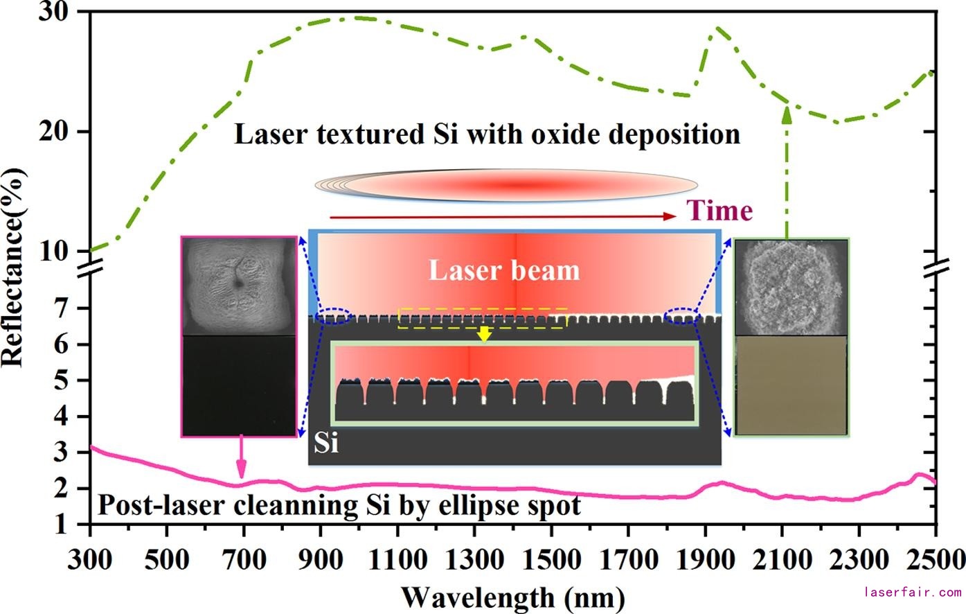 導(dǎo)讀:你沒有看錯(cuò),激光清洗不僅僅是可以用來進(jìn)行清洗!來自西安交通大學(xué)的學(xué)者利用激光清洗的辦法來輻照Si的表面,不僅僅清洗了表面沉積的氧化物,還實(shí)現(xiàn)了微納多尺度表面結(jié)構(gòu)的制備,使得Si表面的抗反射性能進(jìn)一步提高,這一成果發(fā)表在期刊《Applied Surface Science》上。