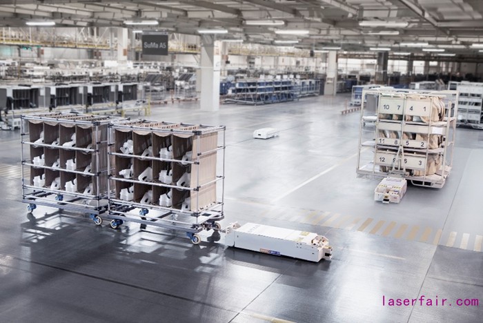總裝車間的零件物料超市面積約3.4萬平方米。數千種需要裝車的零件,先在該區域分類整理,然后通過AGV物流小車,準確地運輸到指定的工位上。此外,運送路線可隨著生產工藝流程的調整而進行優化,極大地提高了生產效率,十分智能化。生產裝配區域由8條主線和4條預裝線組成。12條流水線規劃合理、布置精巧,可以滿足多車型混線生產,生產柔性化程度高。