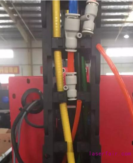 5、拆掉Z軸拖鏈(坦克鏈)5節蓋板,找到給切割頭和光纖頭供水的兩根水管(如下圖所示);