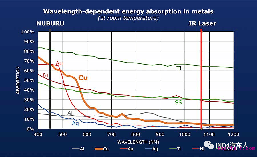 下面兩張圖是不同材料對紅外光、綠光、藍光激光的吸收率實驗,可以清楚看到銅對小波長的藍光吸收率近乎70%,但對紅外光吸收率只有 5%。