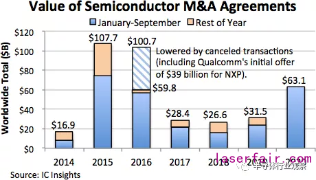 2020年下半年全球半導(dǎo)體產(chǎn)業(yè)最主要的關(guān)鍵詞就是并購(gòu)。盡管到目前為止,半導(dǎo)體領(lǐng)域的并購(gòu)數(shù)量并不多,但涉及金額卻非常龐大。從2020年7月到10月僅僅三個(gè)月多,已經(jīng)宣布的這幾起收購(gòu)案總交易額已經(jīng)達(dá)到1150億美金,從IC Insights統(tǒng)計(jì)的數(shù)據(jù)來(lái)看,目前為止已經(jīng)超過(guò)了2015年的M&A交易額總量1077億美金,因此2020年成為半導(dǎo)體并購(gòu)歷史上交易規(guī)模的最大年份。當(dāng)然由于目前這5起巨量并購(gòu)中的多數(shù)都還需要通過(guò)各國(guó)監(jiān)管部門的審批,因此這個(gè)結(jié)論還有待進(jìn)一步觀察和驗(yàn)證。