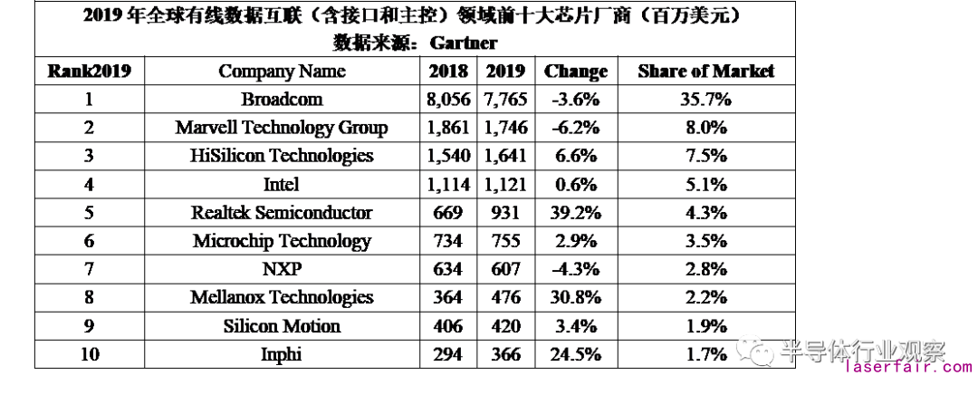 五起并購(gòu)無(wú)論是發(fā)起方還是標(biāo)的方都是全球頂尖級(jí)別的頭部企業(yè)或者是細(xì)分領(lǐng)域的“領(lǐng)頭羊”。比如英偉達(dá)Nvidia、AMD、賽靈思Xilinx、Marvell就分列2019年全球前十大集成電路設(shè)計(jì)企業(yè)的第5-第8名。而ADI和Maxim分列全球第二和第三大模擬類集成電路企業(yè),Intel和SK hynix也位于全球NAND存儲(chǔ)器主要企業(yè)的第五、第六位。Marvell收購(gòu)的Inphi,也是全球有線數(shù)據(jù)互聯(lián)(含接口和主控)領(lǐng)域的前十大芯片廠商之一,而Marvell則在該領(lǐng)域排名第二。