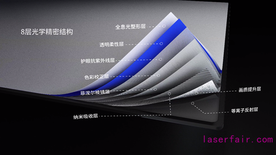 具體來說,ALFA技術實現(xiàn)了專利微納結構設計、全息光整形技術、光吸收納米涂層、超薄柔性復合薄膜四大技術層面的突破,用復雜的光學光刻方法做了屏幕的表面處理,使其在保持了高清、高畫質顯示狀態(tài)的同時,又可以消除鏡面反射的效果,解決了傳統(tǒng)投影屏幕的低增益、亮斑、“鬼影”等諸多行業(yè)痛點。