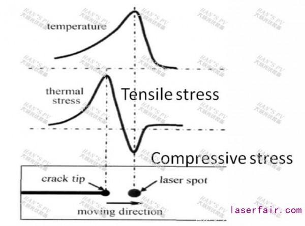 無損激光劃裂核心原理是激光熱應力控制斷裂技術。首先利用激光對材料進行局部快速加熱,隨后配套冷卻技術產生一個不均勻的溫度場,不均勻的溫度場會在材料表面產生溫度梯度,從而誘發熱應力的產生。其中激光光斑中處于壓應力狀態,而激光光斑前后處于拉應力狀態,由于脆性材料抗壓剛度遠大于抗拉強度,當拉應力達到材料的斷裂強度時,就會使材料從電池片邊緣開的超小槽口開始斷裂,進而隨著激光及后續冷卻的移動軌道穩定擴展,見圖四、圖五。