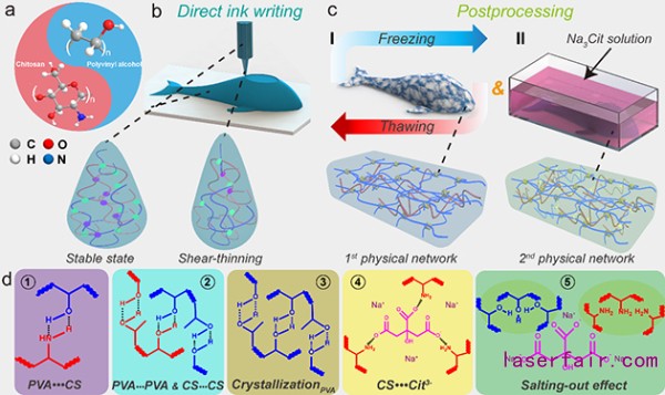 中國科學(xué)院蘭州化學(xué)物理研究所固體潤滑國家重點實驗室研究員王曉龍帶領(lǐng)的團(tuán)隊,通過構(gòu)筑雙物理交聯(lián)網(wǎng)絡(luò)策略實現(xiàn)了超高強(qiáng)韌水凝膠3D打印。如圖1所示,該3D打印超高強(qiáng)韌水凝膠由兩步法實現(xiàn):(1)基于聚乙烯醇(PVA)和可溶性短鏈殼聚糖(CS)水凝膠前驅(qū)體墨水的直書寫(Direct Ink Writing)3D打印成形。(2)依次進(jìn)行冷凍-解凍循環(huán)和檸檬酸鈉溶液浸泡配位交聯(lián)后處理,形成PVA物理結(jié)晶網(wǎng)絡(luò)和CS離子交聯(lián)網(wǎng)絡(luò)的雙物理交聯(lián)網(wǎng)絡(luò)超高強(qiáng)韌水凝膠。