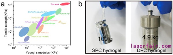 圖2. 3D 打印雙物理交聯(lián)水凝膠力學(xué)性能與展示