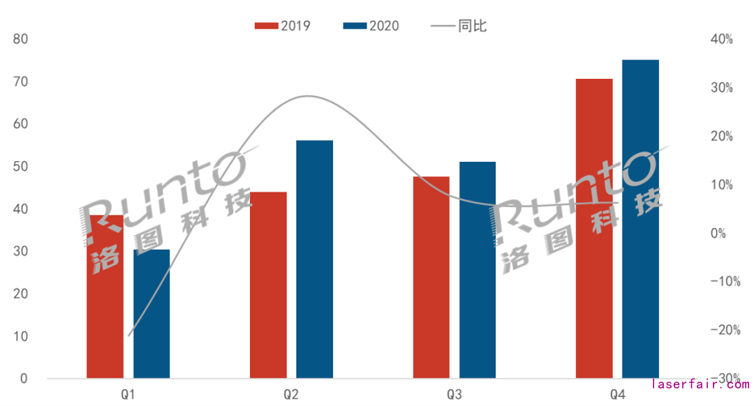 根據(jù)洛圖科技(RUNTO)發(fā)布的《中國大陸激光投影市場分析季度報告》中顯示,2020年中國大陸激光電視市場出貨量超過21.2萬臺,同比增長5.9%。1季度受疫情影響,國內(nèi)激光電視市場同比衰退;2季度產(chǎn)業(yè)鏈加快復工復產(chǎn),品牌積極促銷,激光電視市場回暖,出貨量同比增長近28%;3、4季度激光電視出貨量盡管仍然錄得同比增長,但增幅都在個位數(shù)。主要原因包括2019年同比基數(shù)較高、2020年新品較少、品牌促銷力度有限、銷售渠道拓展節(jié)奏緩慢、其它競品市場擠壓。