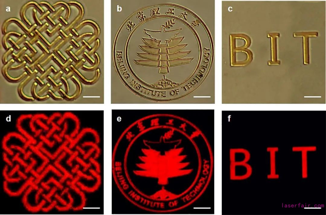 此外,為了證明該技術的普適性,研究人員展示了更加復雜圖案的制備。圖3顯示了使用OLYMPUS MX51光學顯微鏡在白光(圖3a–c)和UV-365 nm光照(圖3d–f)下制作的圖案化鈣鈦礦量子點的光學圖像。圖3 熒光顯微鏡下圖案化的鈣鈦礦量子點的復雜結構 (標尺:10 μm)