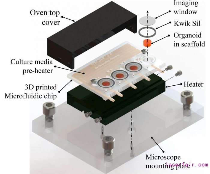 目前對生長中的器官體進行實時觀察的技術涉及使用商業培養皿,在玻璃底板上有許多孔,置于顯微鏡下。這些板子價格昂貴,而且只與特定的顯微鏡兼容。他們不允許流動或補充營養介質的生長組織。