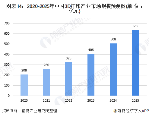 近年來,我國高度重視3D打印市場的發展,國家也不斷出臺政策進行產業扶持,我國3D打印產業市場規模不斷擴大。結合國家層面政策指導以及國內近6年3D打印產業發展態勢,前瞻預測2025年,我國3D打印市場規模將超過630億元。由此可見,3D打印市場崛起,前景廣闊。