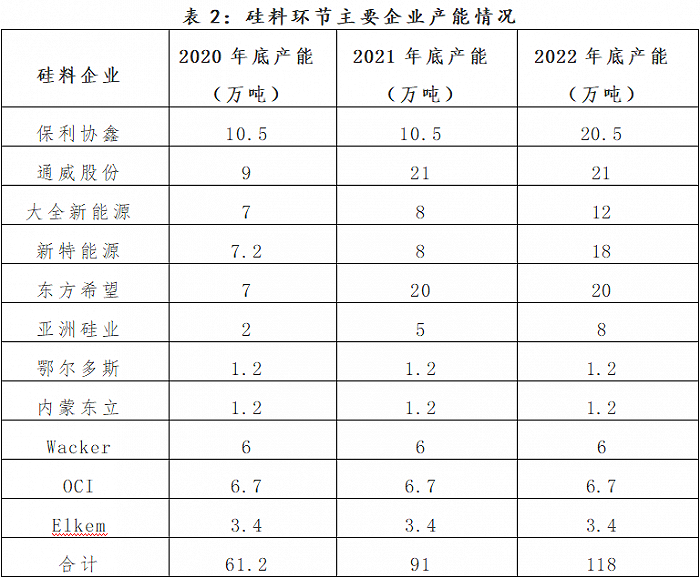 (一)通威股份(600438.SH):目前9萬噸產能,分布在樂山、包頭、保山三大硅料生產基地,包頭通威二期和保山通威產能各4萬噸,四川通威二期4萬噸產能目前建設中,2021年底產能最多或達21萬噸左右;