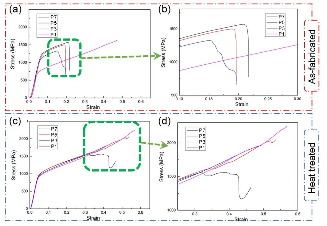 圖4 激光立體成形制備的樣品在加工后(a,b)和熱處理?xiàng)l件下(c,d)的壓縮應(yīng)變-應(yīng)力曲線
