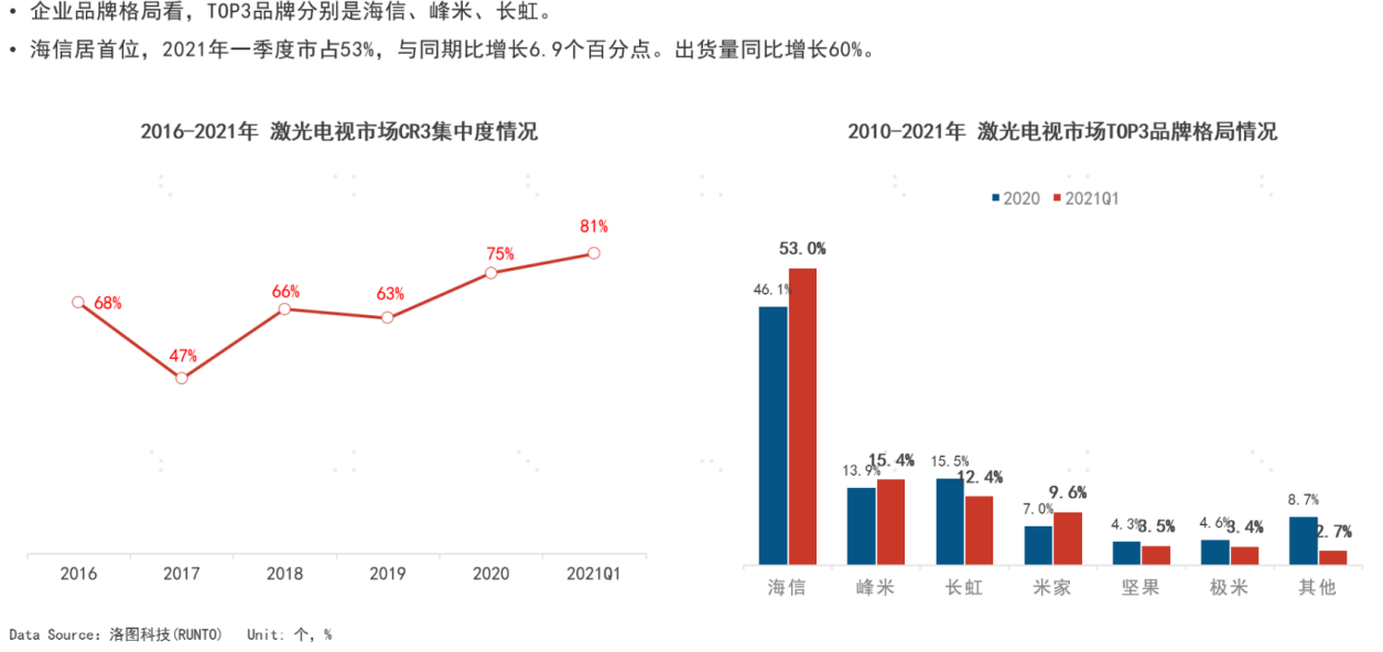 據(jù)《2021中國(guó)激光電視發(fā)展報(bào)告》數(shù)據(jù)顯示,目前激光電視的市場(chǎng)分布,呈現(xiàn)出明顯的頭部效應(yīng)。其中,TOP3品牌分別是海信、峰米、長(zhǎng)虹。 海信居首位,2021年一季度市占53%,與同期比增長(zhǎng)6.9個(gè)百分點(diǎn)。出貨量同比增長(zhǎng)60%。峰米和長(zhǎng)虹排在第二、三位,一季度占比分別為15.4%和12.4%。