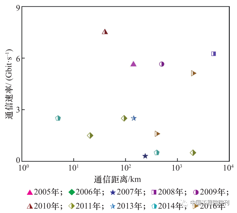 隨著空間激光通信高速調制解調和傳輸技術的快速發展,未來星地激光通信鏈路速率有望達到100 Gb/s量級。高速激光通信采用高階調制方式如正交相移鍵控(QPSK)、正交振幅調制(QAM)和復用方式如波分復用(WDM)、時分復用(TDM)、軌道角動量復用(OAM),短距離(<1 km)速率可達 Tb/s 量級。近年來,國內外高速無線激光通信技術的主要發展現狀如圖2所示。