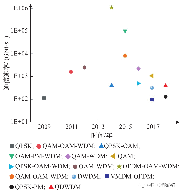 注:1E+0n表示 1×10n ;QPSK代表正交相移鍵控;QAM-OAM-WDM代表正交振幅調制–軌道角動量復用–波分復用;QPSK-OAM代表正交相移鍵控–軌道角動量復用;OAM-PM-WDM代表軌道角動量復用–偏振復用–波分復用;QAM-WDM代表正交振幅調制–波分復用;QAM代表正交振幅調制;QPSK-OAM-WDM代表正交相移鍵控–軌道角動量復用–波分復用;OAM-WDM代表軌道角動量復用–波分復用;OFDM-OAM-WDM代表正交頻分復用–軌道角動量復用–波分復用;QAM-OAM-WDM代表正交振幅調制–軌道角動量復用–波分復用;DWDM代表密集波分復用;VMDM-OFDM代表矢量模分復用–正交頻分復用;QPSK-WDM代表正交相移鍵控–波分復用;QPSK-PM代表正交相移鍵控;QDWDM代表密集波分復用。