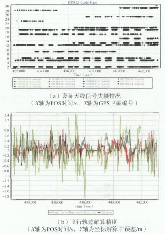 從圖4可以看出,主螺旋槳轉動時,GNSS信號接收仍然有失鎖情況,但對定位精度影響已經不大,地面開車測試時,GNSS基準站距飛機2km,POS數據解算結果為位置誤差±3cm、高程誤差±5cm;飛行作業時,GNSS基準站距作業區30km范圍內,POS數據解算結果為位置誤差±6cm、高程誤差±10cm,測量成果能夠滿足《海道測量規范》要求。